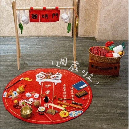 正式抓週:在道具中讓寶寶自由抓選,旁人圍觀驚呼連連,好玩又感動。注意:通常以「第一件拿起並把玩最久的物品」為準,避免過度引導。