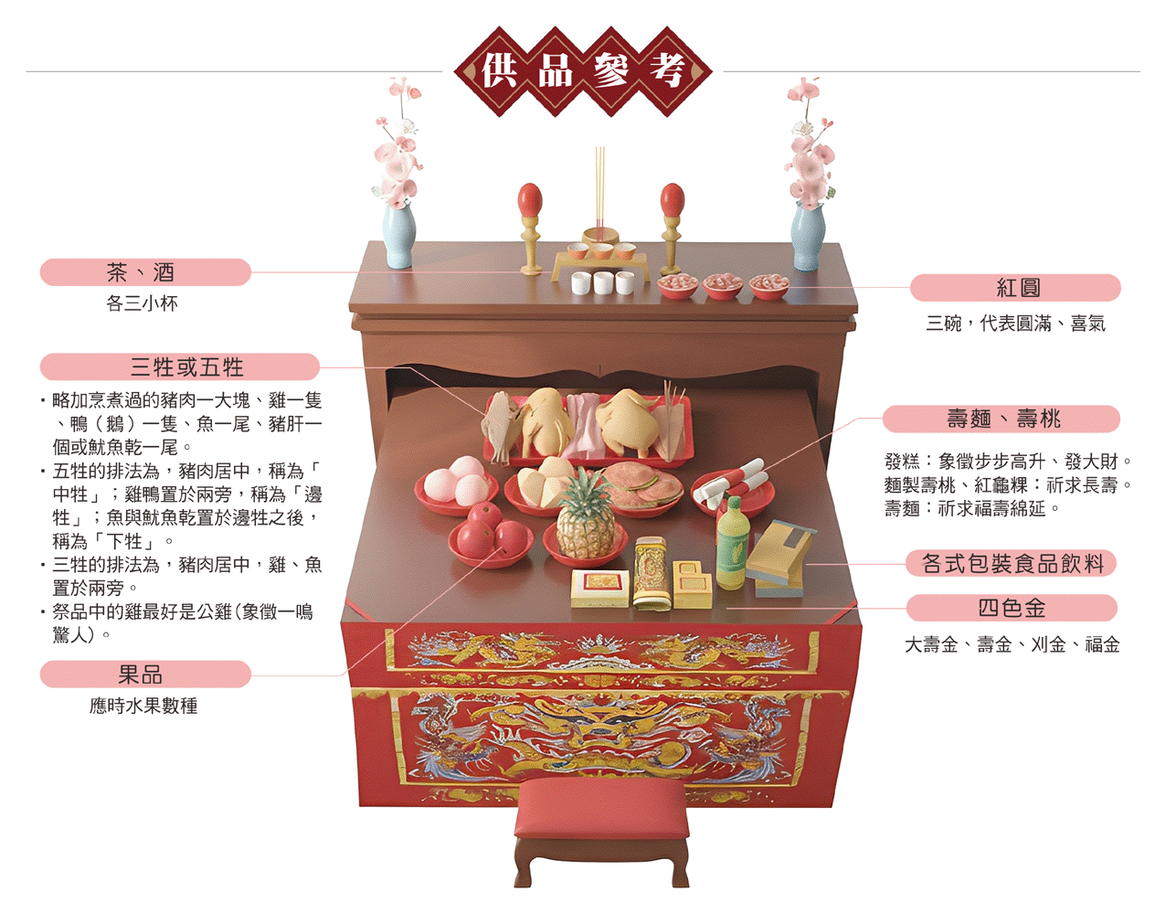 吉祥糕點:發糕(發財)、麵製壽桃、紅龜粿(長壽)。