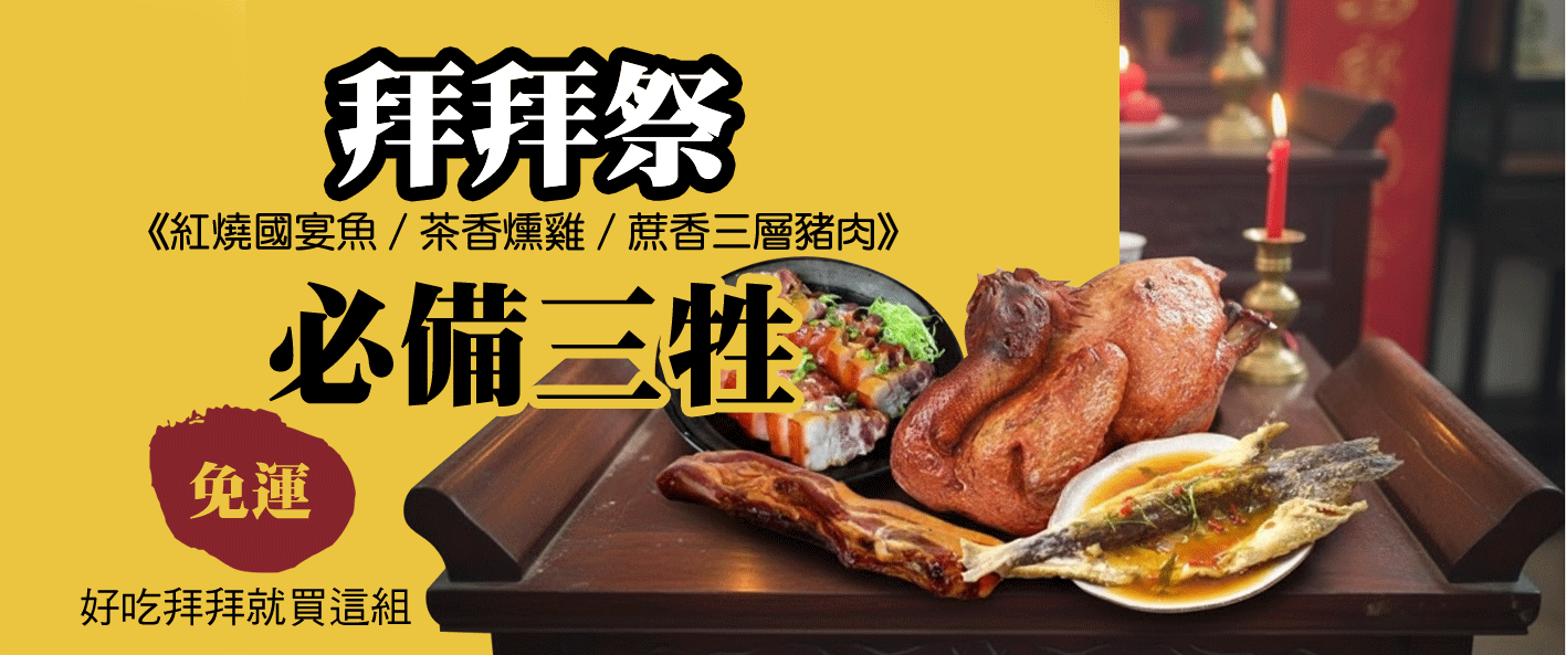 半生熟的三牲或五牲:略加烹煮過的豬肉一大塊、雞一隻、鴨(鵝)一隻、魚一尾、豬肝一個或魷魚乾一尾。