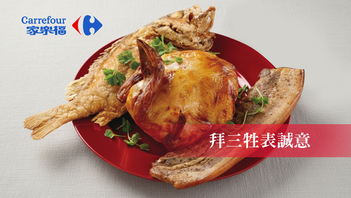 半生熟的三牲:豬肉一大塊、雞一隻、魚一尾。