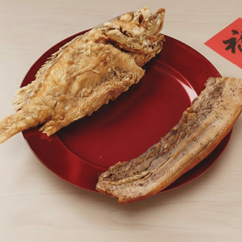 吉祥糕點:發糕(發財)、麵製壽桃、紅龜粿(長壽)及麻粩、寸棗等傳統糕點。